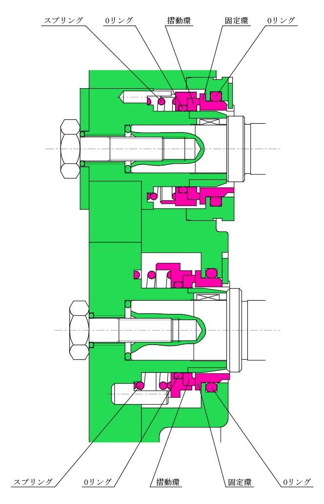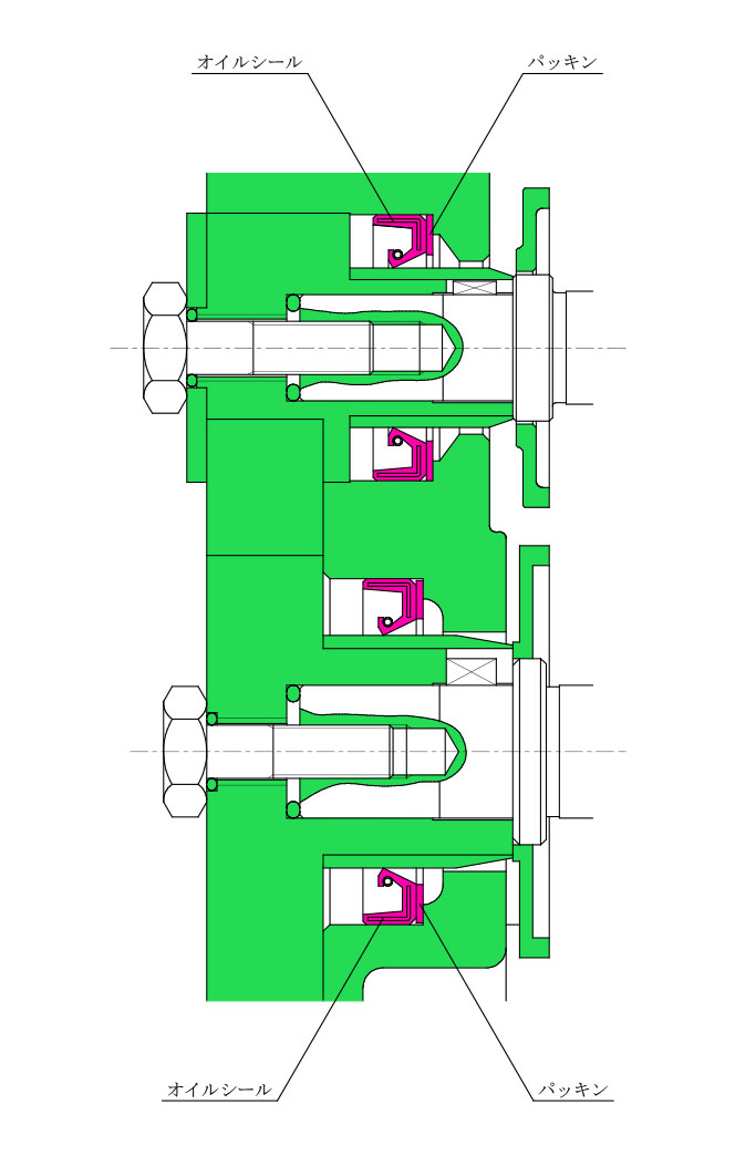 オイルシールやメカニカルシール、Oリングは液にあわせて材質を変更可能です。